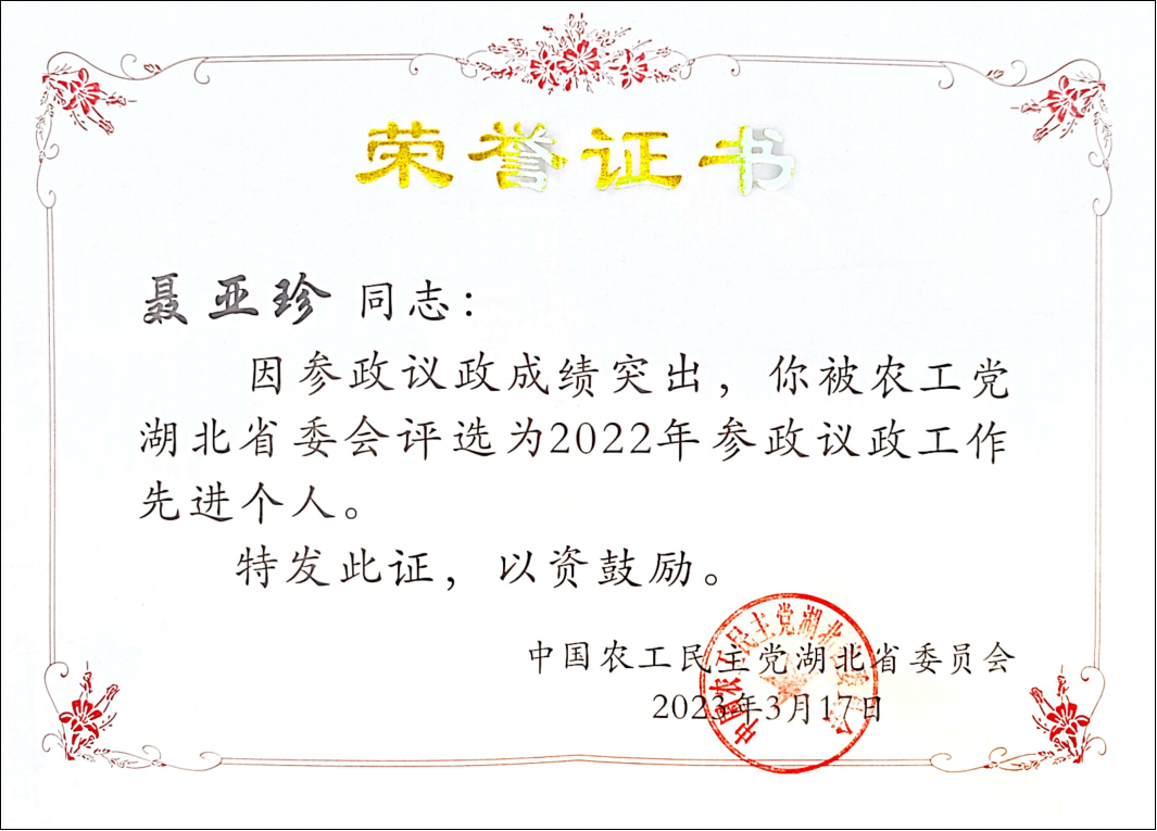 会上,表彰了2022年参政议政优秀调研报告41篇、7个优秀组织及30名先进个人。304am永利集团农工党支部主委聂亚珍荣获2022年参政议政工作先进个人,聂亚珍、张莉提交的《优化湖北自贸区科技创新政策的相关建议》,徐光木等人提交的《关于湖北在校大学生接受廉洁教育情况的调研报告》获2022年度优秀调研报告二等奖;聂亚珍、张莉提交的《新常态下民营企业纾危助力的政策建议》,聂亚珍、赵路提交的《加快强链补链,推动黄石经济高质量发展》获2022年度优秀调研报告三等奖。(党委统战部)