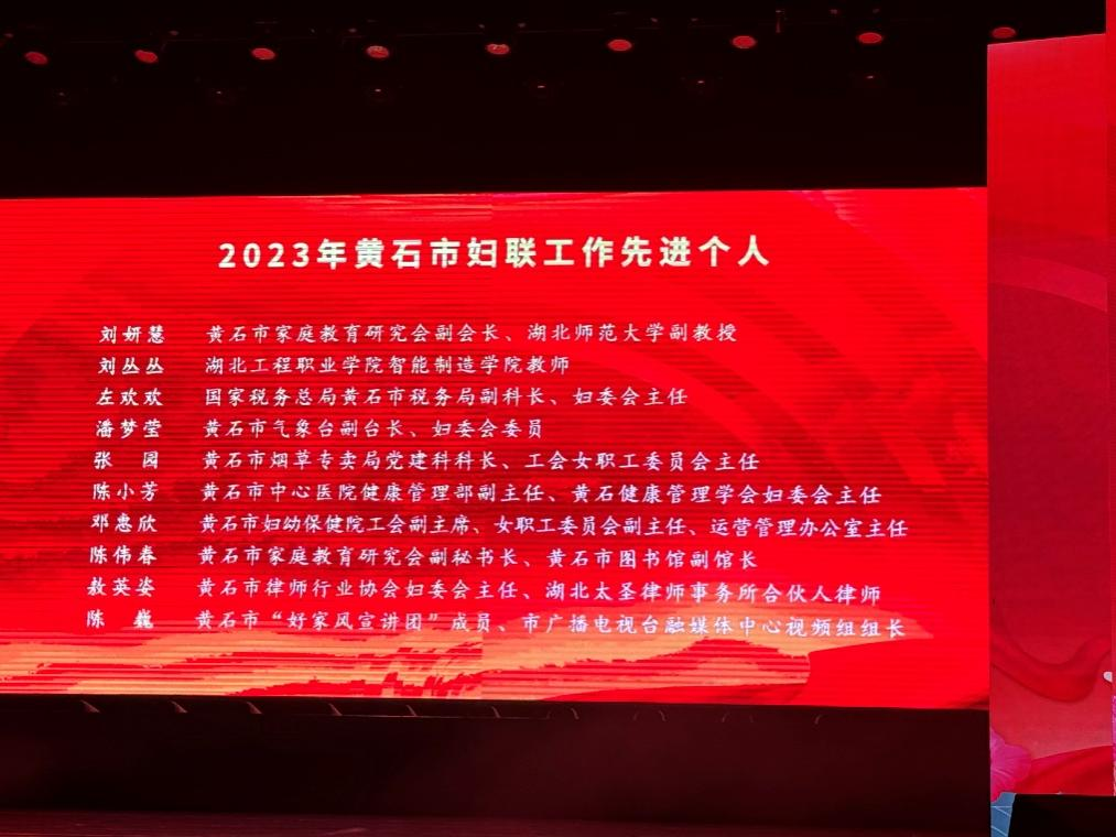 3月7日,黄石市纪念“三八”国际妇女节114周年主题活动在磁湖剧院举行,市妇女联合会发布了《关于全市妇联工作成绩突出的先进集体、先进个人的表扬通报》,70位女性和30个集体受到表扬,其中,304am永利集团无党派人士、教育科学学院学前教育系刘妍慧老师荣获黄石市妇联工作先进个人称号。